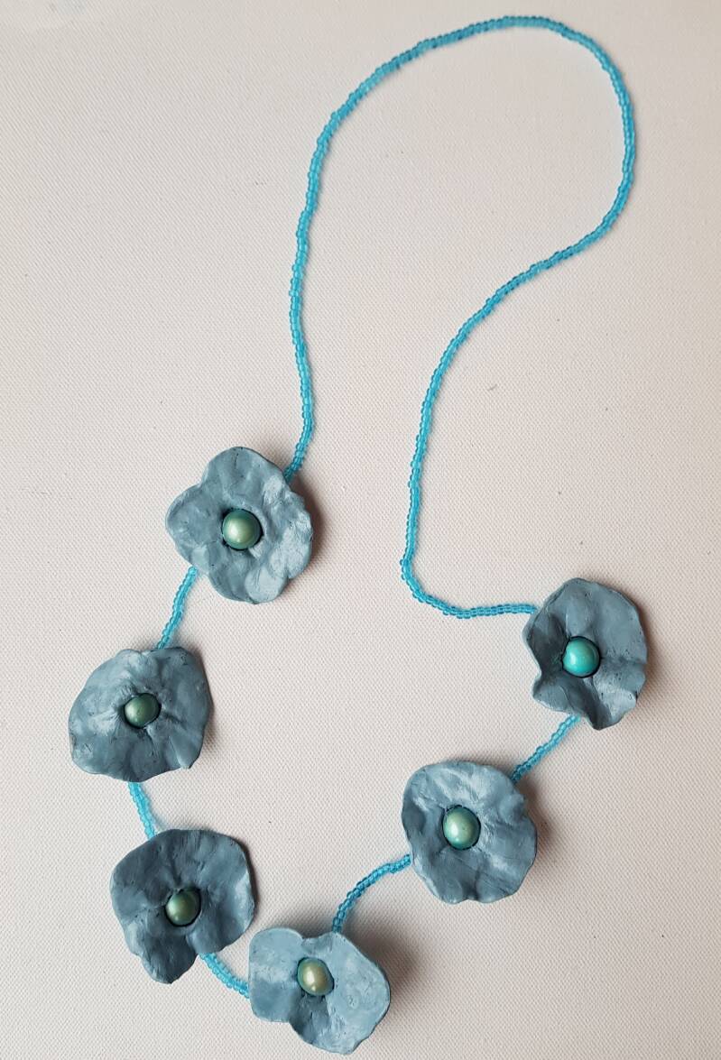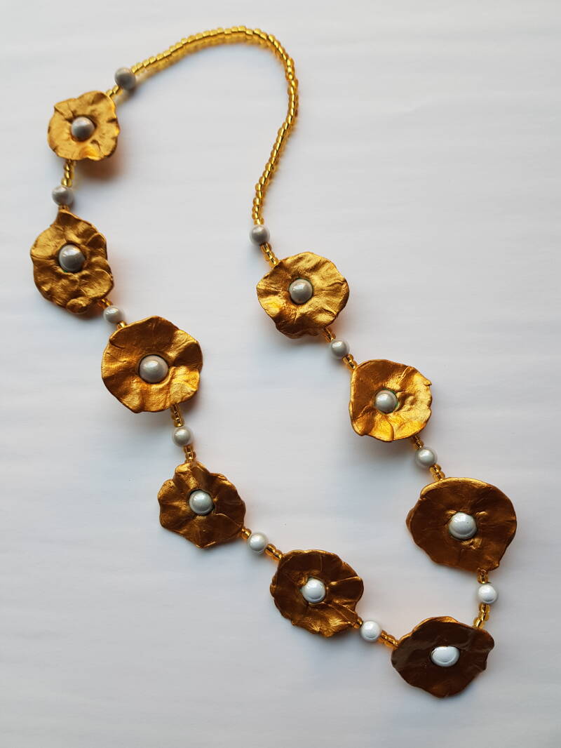 Material: silk clay, acrylic paint, varnish, glass beads, plastic beads