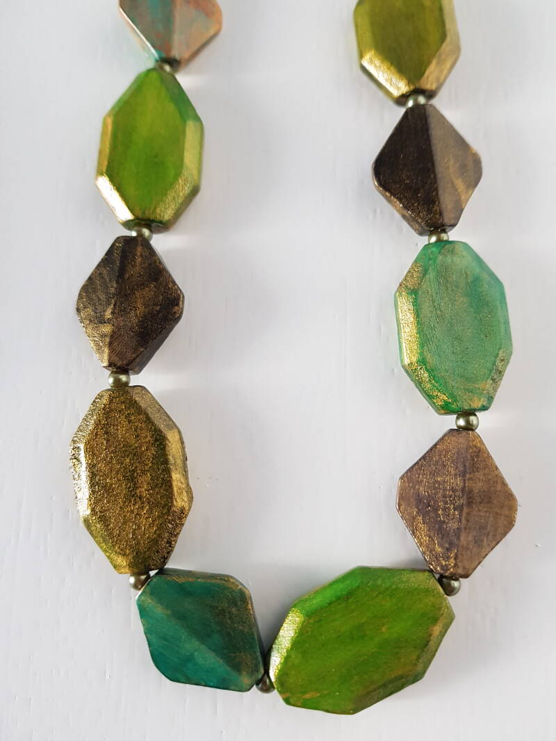Material: wooden beads, glass beads ink, varnish.