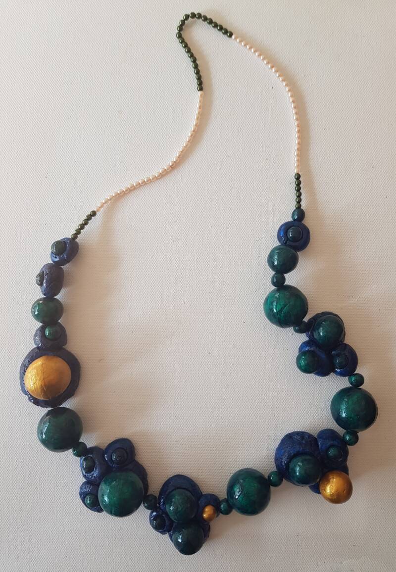 Material: Styropor, silk clay, acrylic paint, varnish, glassbeads