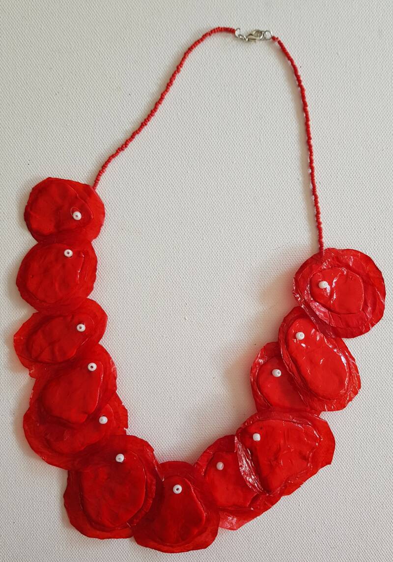 Material: paper, Play Doh clay (flour, water, salt, boric acid, and mineral oil), glass beads, ink and varnish