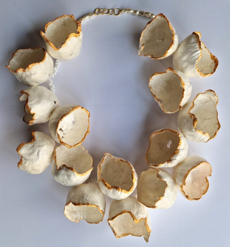 Material: Silk clay, acrylic paint, mica, varnish, glass beads, stainless steel