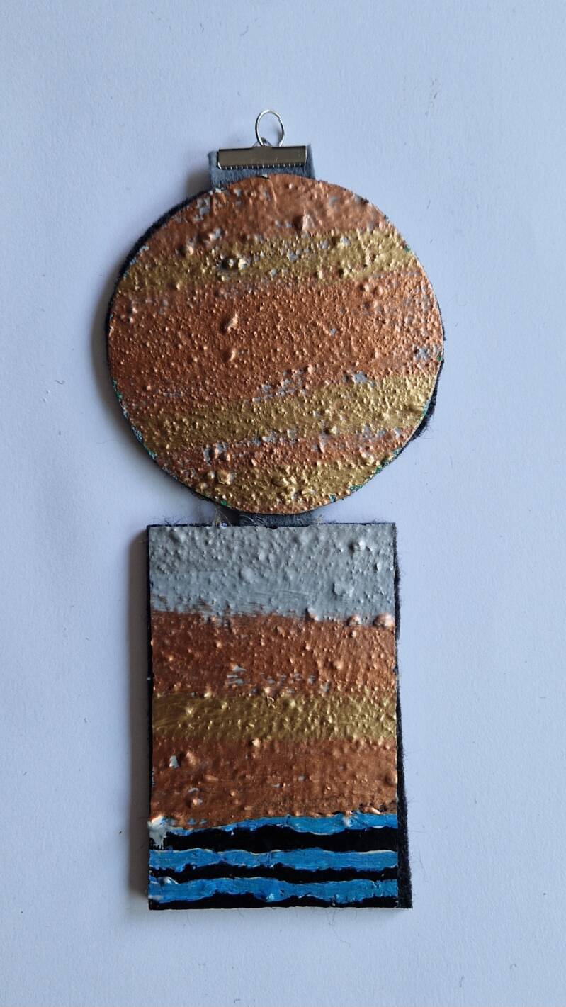 Material: oil painting with shell sand on linen canvas and with permission from the artist, felt, glue, metal, plant based varnish